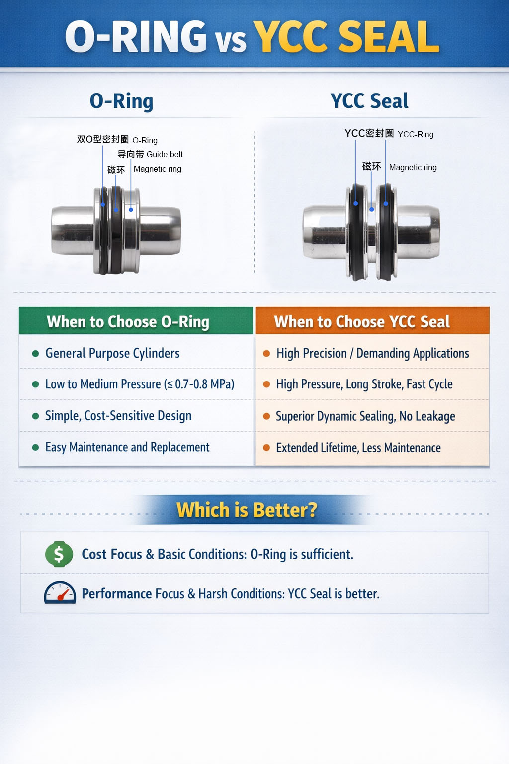 Дәстүрлі O-сақиналармен салыстырғанда, YCC тығыздағышы жақсырақ динамикалық тығыздау мен тозуға төзімділікті қамтамасыз етеді, бұл цилиндрге қысымның өзгеруі және қайталанатын циклдар кезінде сенімді өнімділікті сақтауға мүмкіндік береді. Бұл ерте ағып кетуді айтарлықтай азайтады және техникалық қызмет көрсету аралықтарын ұзартады.