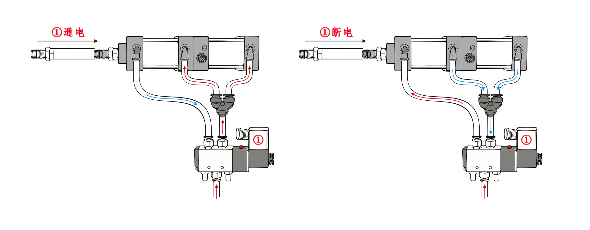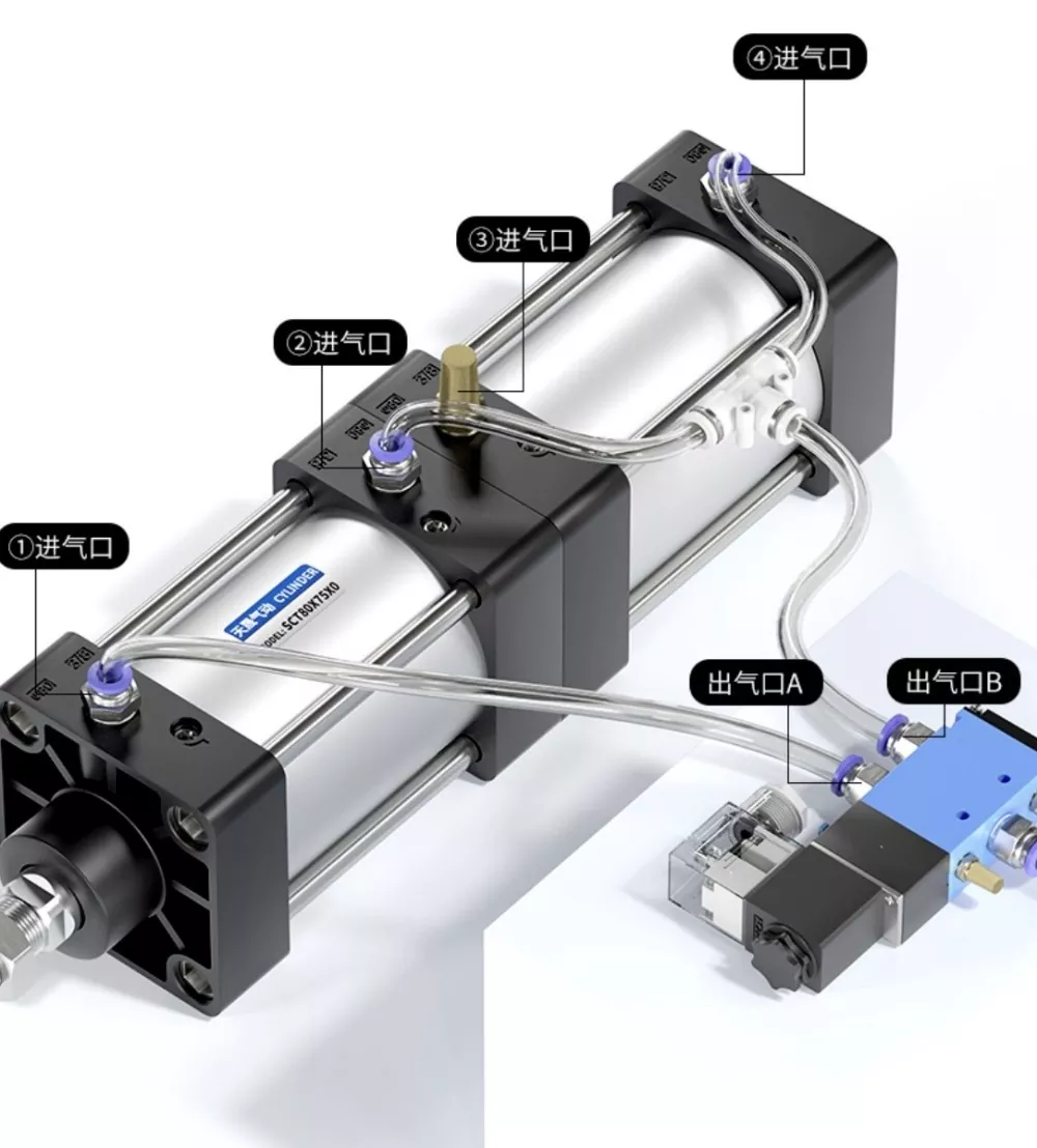 Цилиндрдің әуе кірісі, соленоидты клапанның а портына және соленоид клапанының В портына арналған серияға қосылған цилиндрдің ауа кіретін жер құйыңыз. Silenceer компаниясына қосылған цилиндрдің ауа кірісі. Соленоидты клапанның а портын қуатталған кезде, цилиндрлер тартылған күйде қалады. В порты қуатталған кезде, цилиндрлер жұмыс істей бастайды.
