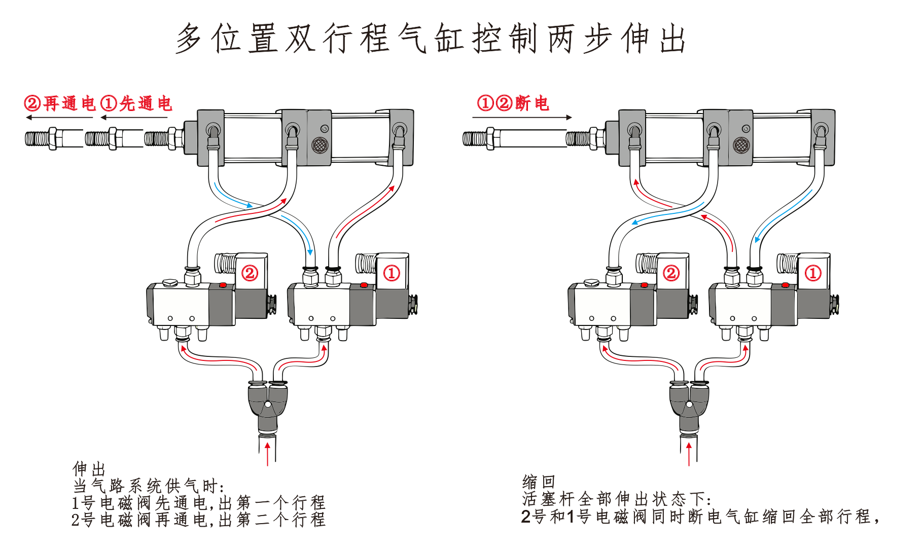 №1 және №2 соленоидты клапан да қуаттандырады, ал цилиндр толығымен тартылады.