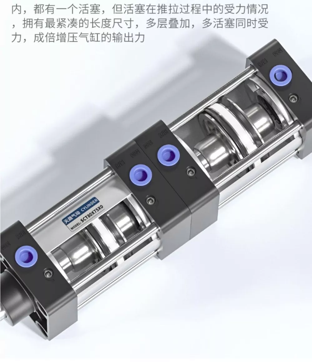 SCT Tio-Rod цилиндрі екі бағытты YCC YCC герметикалық сақиналары және тығыз қосарланған дизайн, жылдам әрекет пен тегіс, тұрақты шығуды қамтамасыз етеді. Цилиндрдің әр қабатын құрамында жеке поршень бар, ал Push-тарту процесі кезінде бірнеше поршеньдер бар, бірнеше поршеньді бөліседі, бұл цилиндрдің көп қабатты құрылымы арқылы көбейтілген шығыс күшімен көбейтілген ұзындығына қол жеткізуге мүмкіндік береді. Бұл екі қабатты дизайн күшті қуат береді, ал алты герметикалық қоңырау конфигурациясы герметикалануы керемет герметикалануды қамтамасыз етеді, бұл цилиндрді ағып кетпестен 1,4 МПа-ға дейін ұстап тұруға мүмкіндік береді.