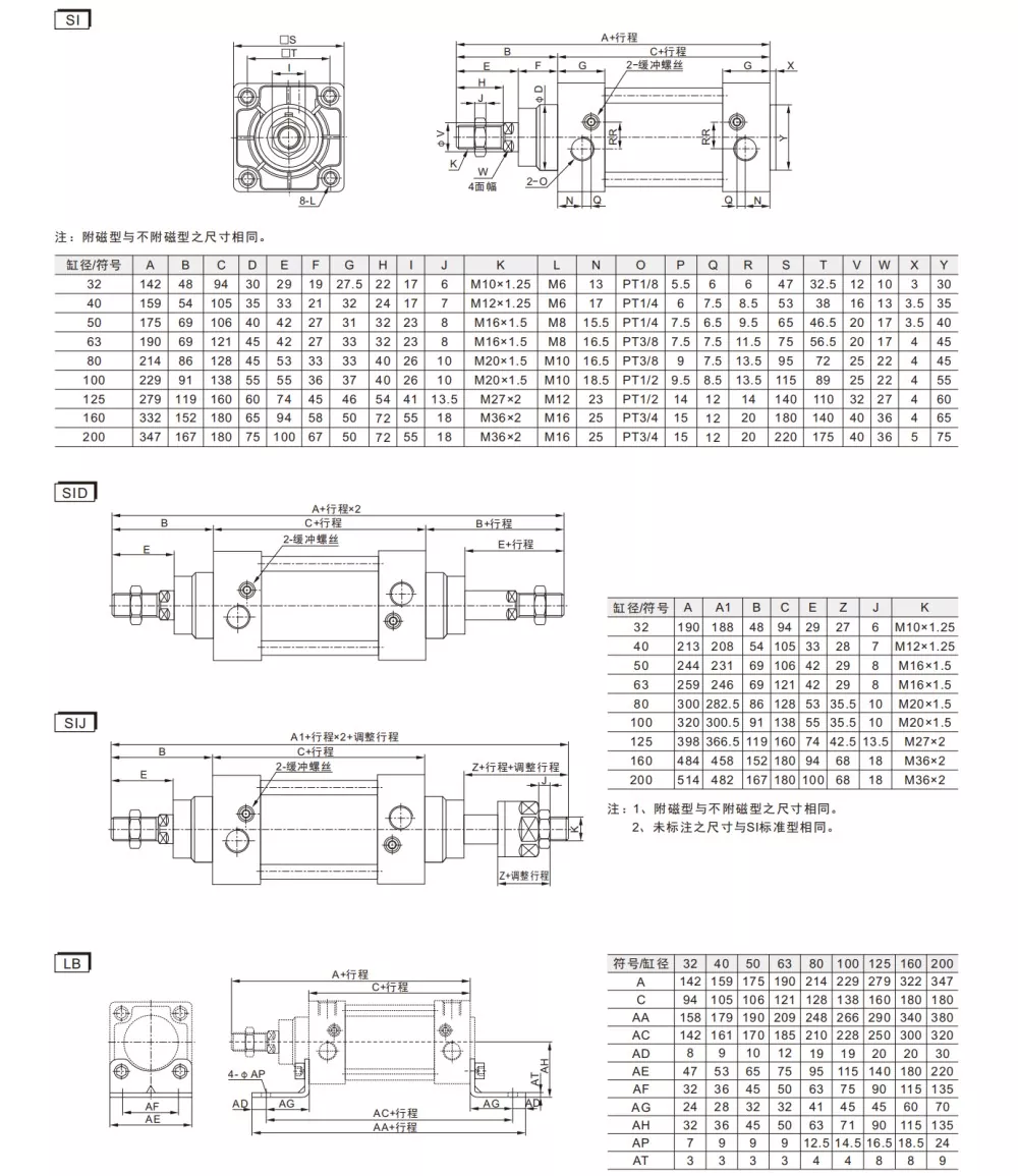 SI сериялары ISO15552 стандарт пневматикалық цилиндр үш түрінде қол жетімді: стандартты екі жақты актерлік, SID екі жақты екі жақты және SIJ қос сүйектері реттелетін инсультпен қос Олар ISO 15552 стандартына сәйкес келеді, яғни олардың орналасу өлшемдері үлкенірекСу пневматикалық цилиндрлербірдей мөлшерде. Тіркелген аксессуарлар ауыстырылмайды және тек ISO 15552 (бұрынғы ISO 6431) техникалық сипаттамаларына сәйкес келеді.